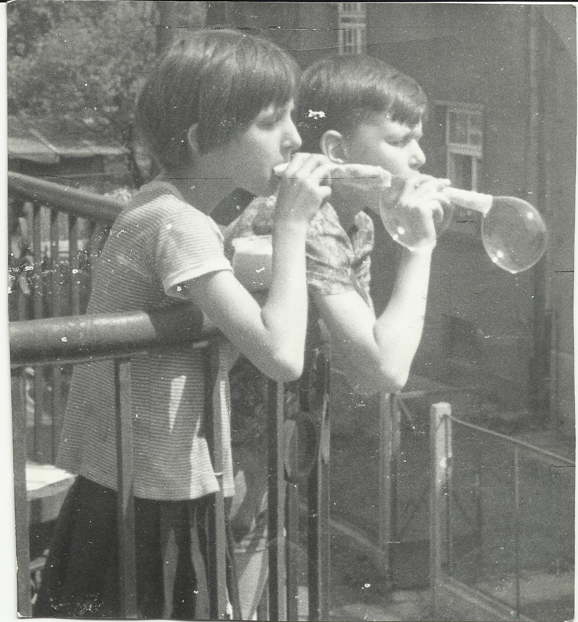 Poniżej zdjęcie Anny Pagaczewskiej z kuzynem Tadzikiem Olszowskim 5 lat później, na balkonie przy Biernackiego 9 – wiosna 1963 – puszczanie baniek mydlanych.