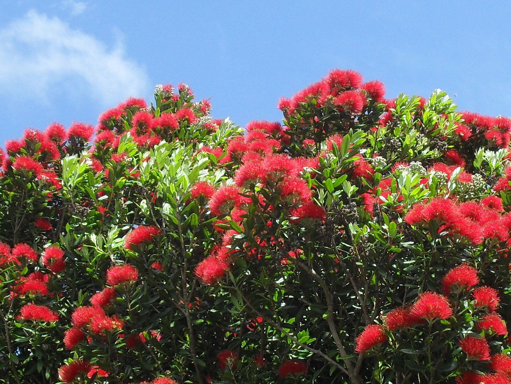 [Metrosideros wyniosły, maori: Pohutukawa (Metrosideros excelsa) – gatunek rośliny z rodziny mirtowatych. Pochodzi z Nowej Zelandii, ale rozprzestrzenił się także w Australii i Afryce Południowej[2]. Ze względu na bardzo twarde drewno wraz z kilkoma pokrewnymi gatunkami z rodzaju Metrosideros nazywany drzewem żelaznym. Kwitnie zwykle w okresie Bożego Narodzenia, stąd zwyczajowa angielska nazwa „Christmas tree”[3]. Drzewo dobrze znoszące trudne warunki na wybrzeżu morskim. Jedno z najbardziej typowych drzew Nowej Zelandii.]
