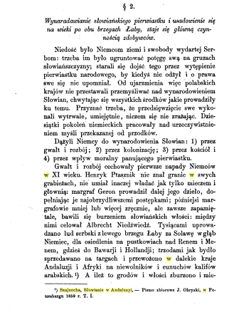 Autor znów cytuje sądy zachodnich „naukowców” i źródło, którego nie interpretuje osobiście, lecz powtarza wersję „nauki niemieckiej”. Przecież sam fakt stwierdzający, że Luzane (Łużyczanie) są najliczniejszym ludem Słowian powinien wzbudzić u niego refleksję, że był to lud raczej nieliczny w porównaniu z innymi, ale za to w latach 900-1100 najbardziej napastowany i stąd stał się źródłem znacznego napływu niewolników, zdobywanych tam przez zachodnie rycerstwo w ramach zbrojnych wypraw.