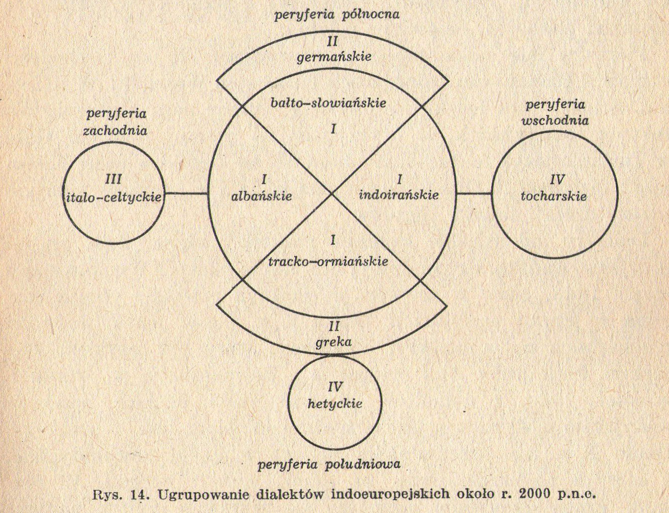 Schemat języków indoeuropejskich według językoznawcy, profesora UJ Tadeusza Milewskiego – dotyczy czasu 2000 p.n.e. Wyraźnie można zobaczyć, że położenie języków bałto-słowiańskich jest centralne i że musiały one mieć wpływ na inne grupy centralne, a poprzez nie na grupy peryferyjne. Dzisiaj moglibyśmy grupę italo-celtycką przykleić do okręgu na zachodzie i północy, a grupę germańską przedstawić na północy jako bańkę powstałą na styku z mieszaniny słowiańsko-celtyckiej i staroeuropejskiej (czyli iliryjsko-ilmerskiej = albańsko-trackiej). Musielibyśmy zlikwidować też Bałtów i dodać Finów, a Bałtów pokazać jako mieszaninę fińsko-słowiańską oraz staroeuropejską. Poza tym wiele by się tutaj nie zmieniło w świetle genetyki. A więc był to wyjątkowo celny schemat. Gdyby dodać kolory, to jednym kolorem wyróżniono by grupę słowiańsko–indo-irańską, jako aryjską. Gdyby ten schemat uszczegółowić to w grupie słowiańskiej kluczowa byłaby pozycja języka polskiego i słoweńskiego jako najbliższych scyto-sarmato-staroeuropejskiego i od nich pochodne: serbo-chorwacki, serbo-łużycki, czeski, słowacki, rusińskie (łemkowski, bojkowski, wołoski), bułgarski i języki ruskie (białoruski, ukraiński, rosyjski).
