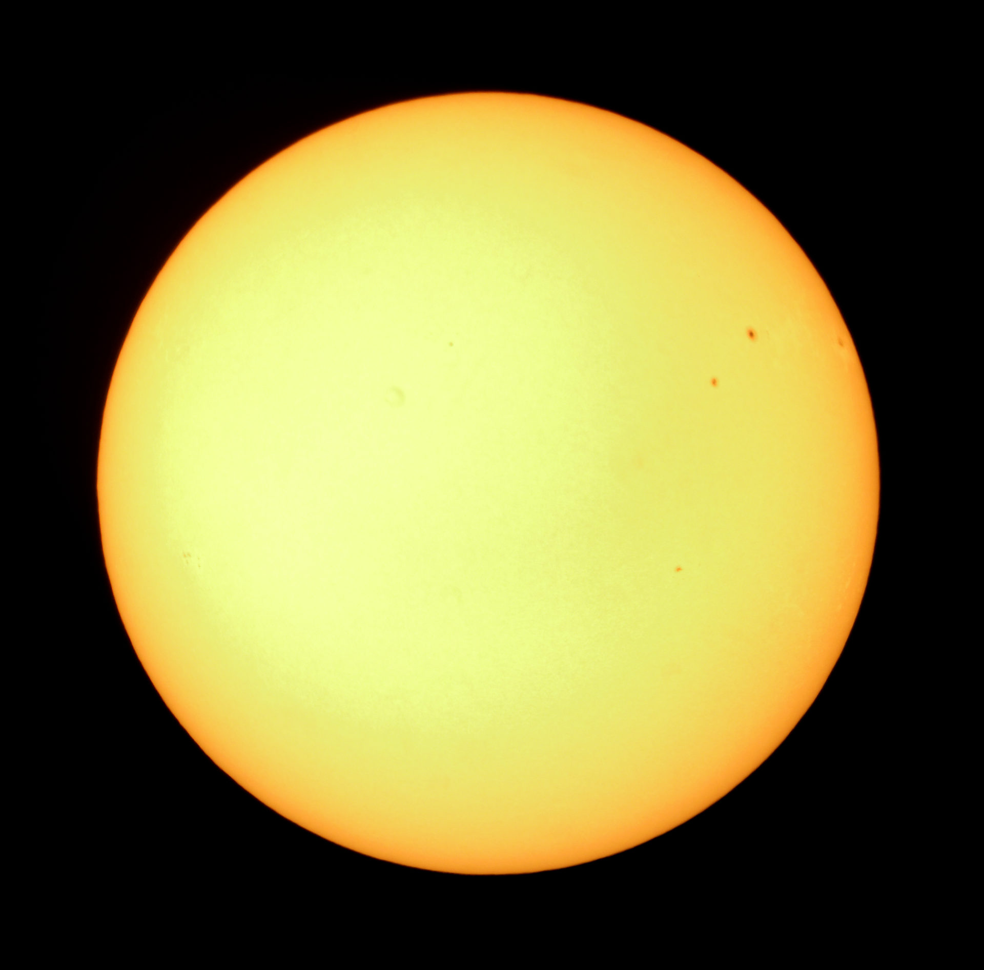 Le Soleil. Photo prise avec un Canon Powershot S100 en afocal derrière un télescope Celestron C8 (avec filtre solaire) de 2000 mm de focale équipé d'un oculaire de 40mm de focale.