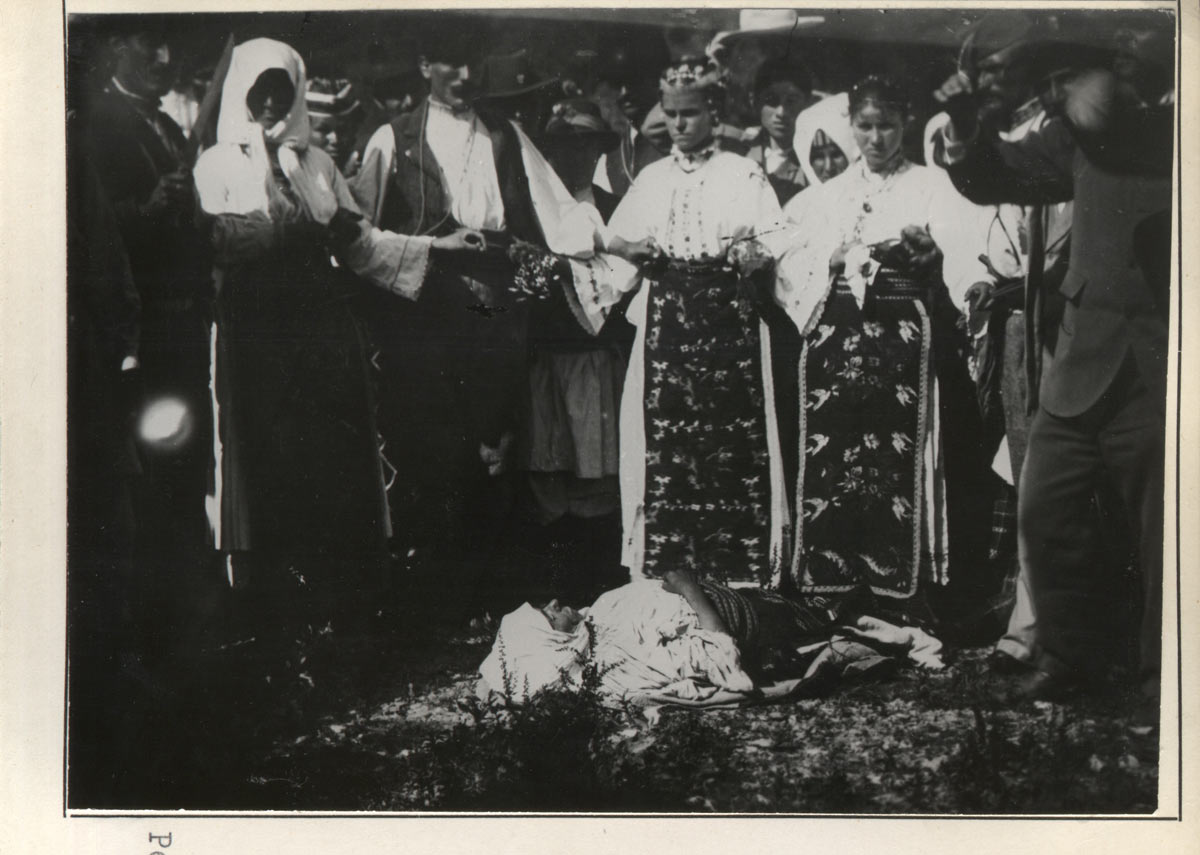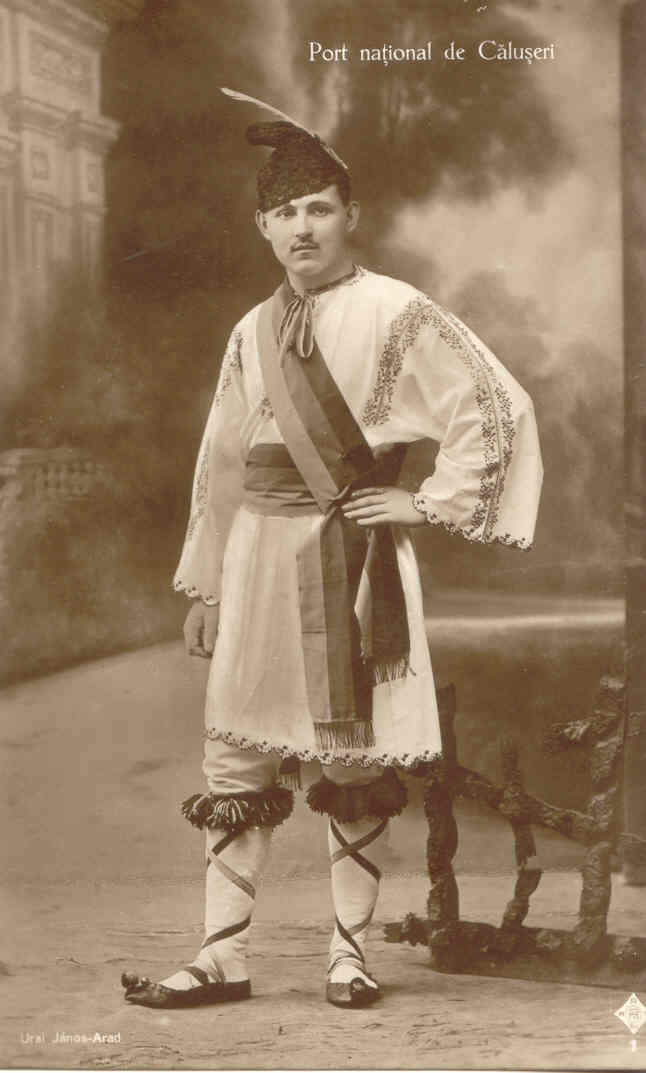 …Кроме таких танцев, во время празднеств существуют ещё другие, связанные с суевериями, которые должны составляться из семи, девяти, одиннадцати и вообще нечётного числа танцующих. Эти танцоры называются кэлушари. Собираются они один раз в год, одевшись в женские платья, на головы надевают венки, сплетённые из листьев полыни и украшенные другими цветами, и, чтобы их нельзя было узнать, говорят женскими голосами и накрывают лицо белым платком. Держат в руках обнажённые мечи, которыми могут пронзить любого простого смертного, если он осмелится снять покрывало с их лица. Это право даёт им древний обычай, так что никто не может быть обвинён за это в убийстве человека. Предводитель такой группы танцоров называется старица, его помощник — примицерий. На обязанности последнего лежит спрашивать у старицы, какой танец он собирается начать, и незаметно сообщить об этом остальным танцорам, чтобы народ не узнал названия пляски до того, как увидит её собственными глазами, так как у них имеется более ста музыкальных мотивов, по которым составлены танцы. Некоторые из них настолько мастерски исполняются, что плясуны едва касаются земли и как будто летают по воздуху. Танцуя и прыгая так, они обходят города и села в непрерывных плясках в течение десяти дней между Вознесением Господним и Святой Троицей…[3]