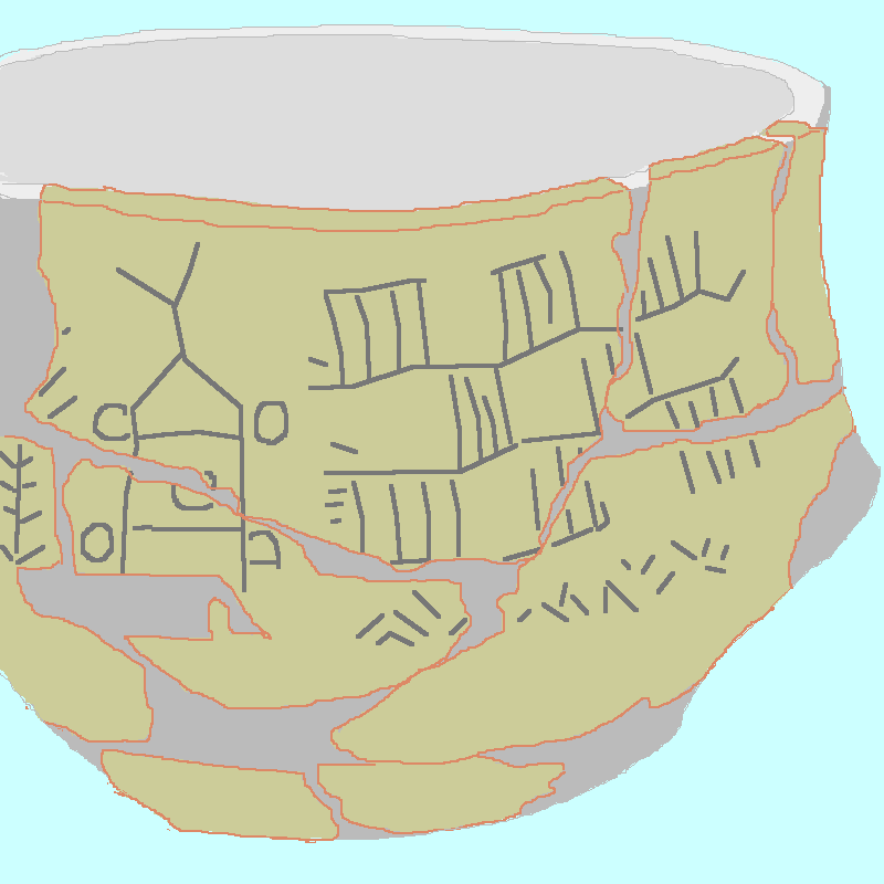 Ornament przedstawia symbolicznie kluczowe elementy prehistorycznego środowiska przetworzonego przez człowieka. Najważniejszą częścią dekoracji jest 5 szczątkowych wizerunków przypominających wóz. Przedstawiają one czterokołowy pojazd z dyszlem dla zwierząt pociągowych. Linie łączące koła prawdopodobnie reprezentują osie. Koło pośrodku być może symbolizuje pojemnik na zbiory.