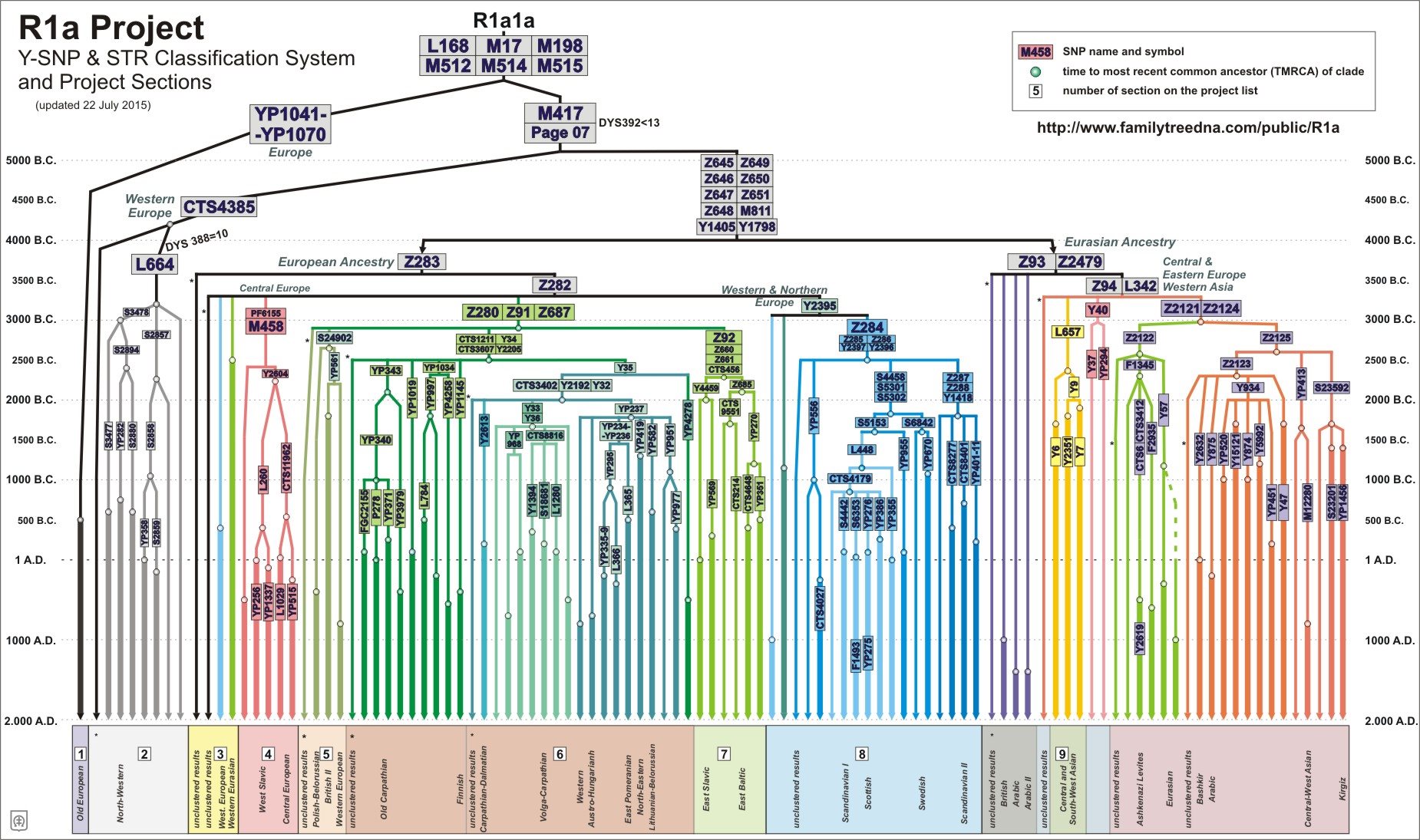 W Europie wspólny przodek (MRCA) podgrup haplogrupy R1b pojawił się około 2500 lat a.C. (p.n.e.), co jest najstarszym w Eurazji świadectwem jej istnienia. Jest to czas kultury kurhanowej w Europie Środkowej i Wschodniej.
