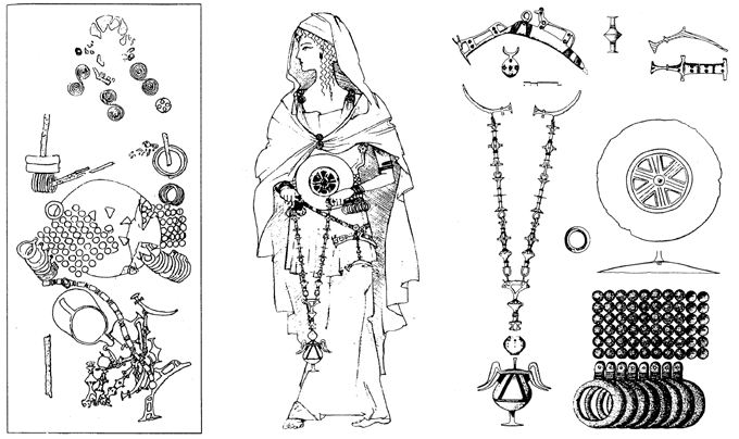 Została pochowana tak zwanymi rytualnymi brązami kultury peoniańskiej. Miała także długi łańcuszek do paska, na którego końcu zawieszono miniaturowy dzbanek (czarę, kaptorgę metalową CB) w kształcie główki maku lekarskiego, z ptasim protomem (uchwytami w kształcie dziobów). Dzbanek, który, jak wiemy na podstawie analizy materii zawartej wewnątrz, zawierał surowe opium.