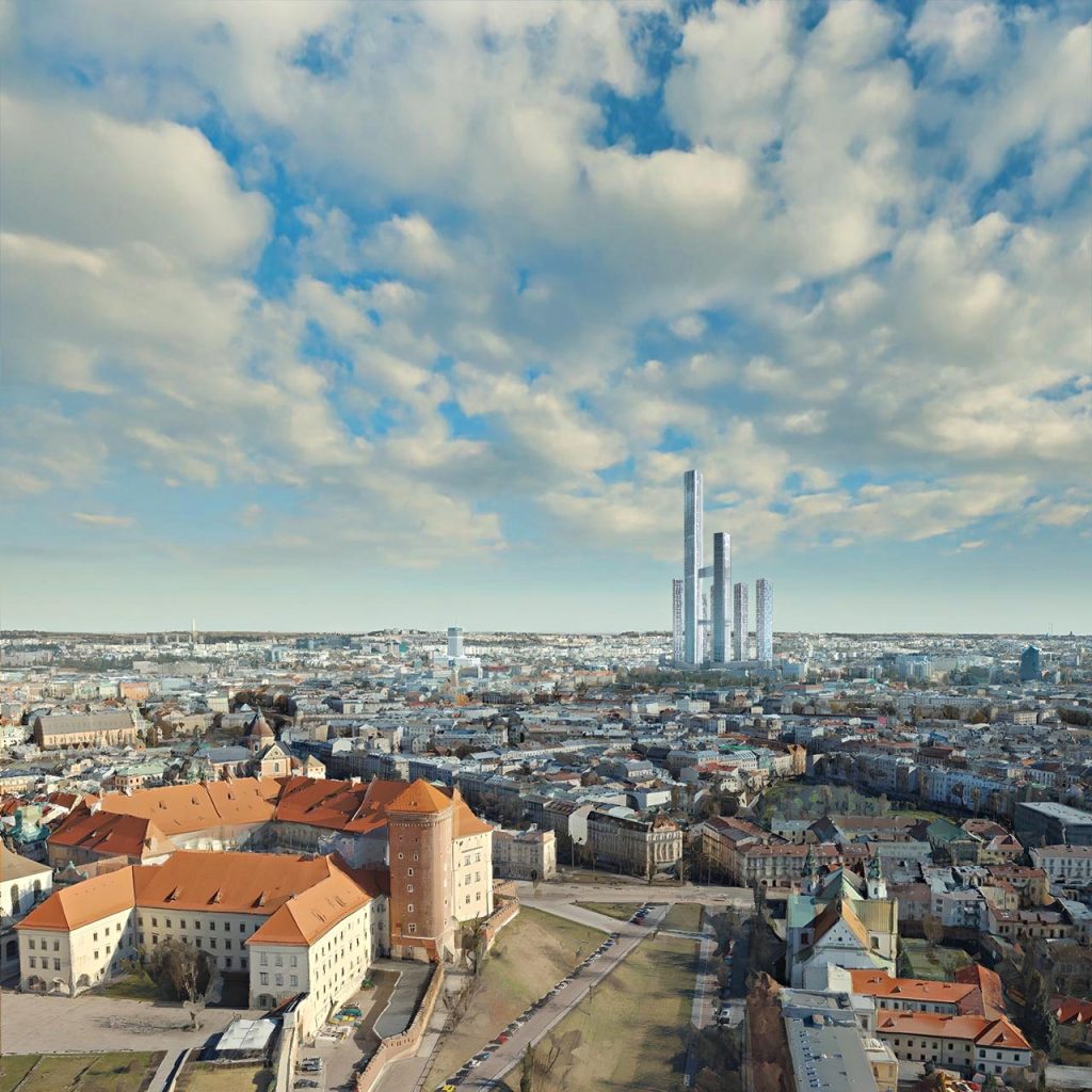 Na wizualizacjach widzimy kompleks wieżowców tak wysokich, że Unity Tower wygląda przy nich jak maleństwo, zwykły blok. Potężne drapacze chmur zajmują południowo-wschodni kwartał przy rondzie Mogilskim. To rejon sądów, szkoły prokuratorów, kamienic i bloków mieszkalnych (m.in. Grzegórzki Park) oraz ogródków działkowych. Wizja więc efektowna, ale jednak niemożliwa do zrealizowania. A przynajmniej nie teraz, nie w tym w miejscu i nie przy obowiązujących w Krakowie przepisach. Za to będąca świetnym pretekstem do rozmowy o przyszłości miasta.