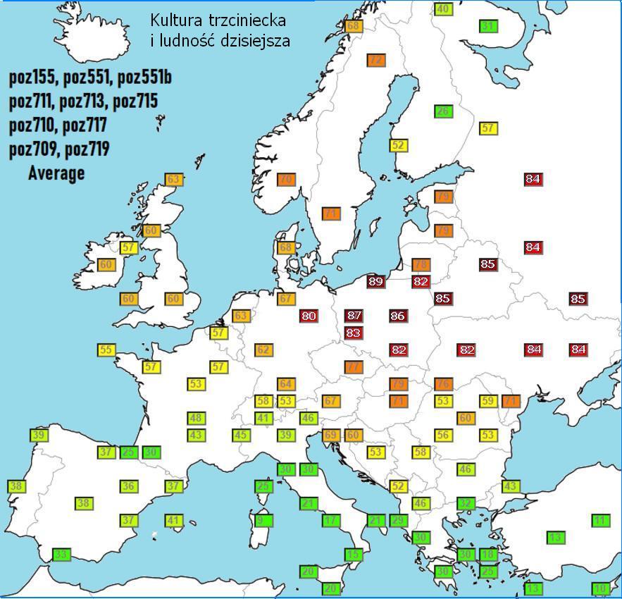 Poniżej ostatnia już mapa pokrewieństwa Polaków wywodzących się z czasów i obszaru Kultury Trzcinieckiej do dzisiaj w Europie: