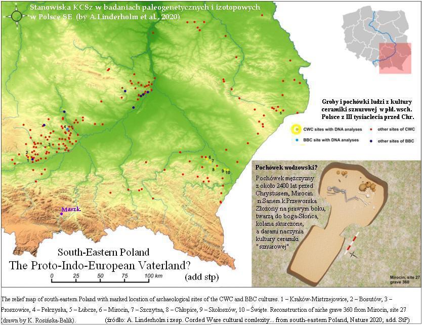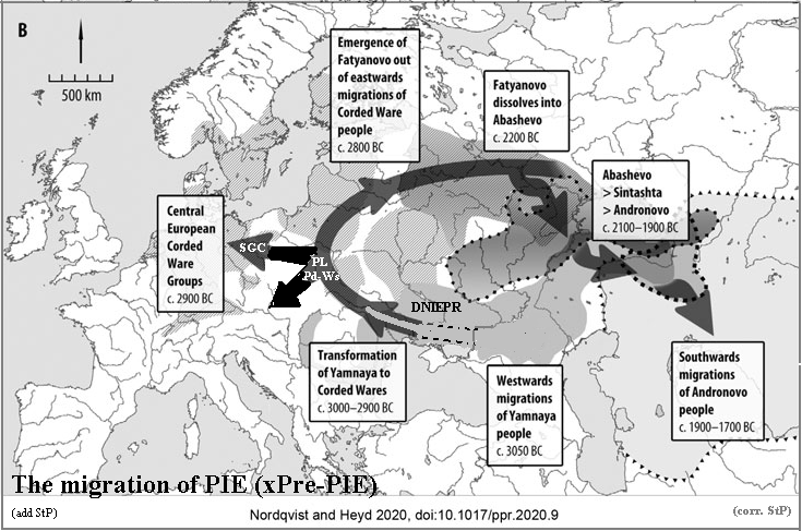 „Autorzy tej mapki jednak znacznie przesadzili, lokalizując początek migracji w międzyrzeczu Wołga-Don! Przecież już wiemy, iż nie ma śladów w badaniach genetycznych próbek Fatjanowo, wskazujących na bezpośrednie pokrewieństwo z tamtejszą ludnością stepową. Bardziej już prawdopodobnym miejscem rodowego pochodzenia byłoby przedpole Karpat (w pasie od Dolnego Dunaju, wzdłuż Prutu do południowej Lubelszczyzny – m. Hubinek), gdzie niektórzy archeolodzy dopatrują się śladów genezy kultury ceramiki sznurowej w formie przedsznurowej, tzw. hoyzont CWC-X przedkurhanowy, przed horyzontem paneuropejskim CWC-A, z możliwością datowania na lata od około 3100 przed Chr. (Juras 2018, Włodarczak 2018, Kośko 2000 i 2018).