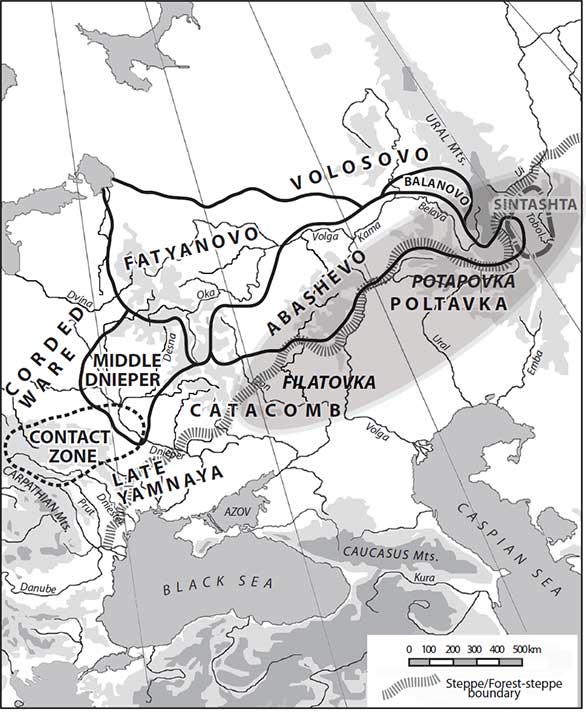 Late Middle Bronze Age cultures with the Proto-Indo-Iranian Sintashta-Potapovka-Filatovka group (shaded). After Anthony (2007 Figure 15.5), from Anthony (2016).