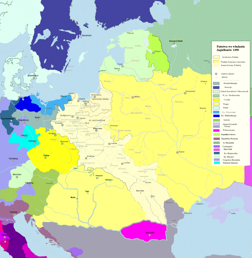 Obszar władania Jagiellonów w roku 1490 (odcienie koloru kremowego i żółtego) oraz bezpośredniego wpływu Jagiellonów pod koniec XV wieku – kraje Bałtów (odcienie jasnozielonego) oraz – Wołoszczyzna (kolor jaskrawo różowy)