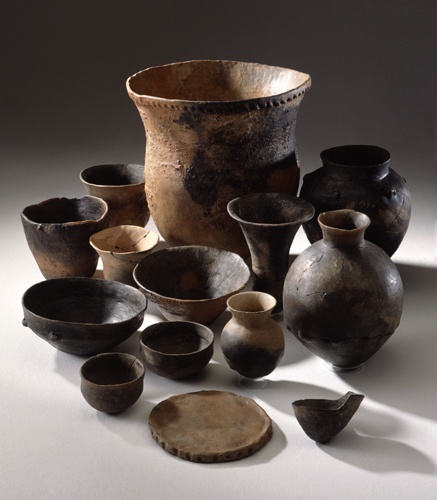 Dieses reiche Keramikspektrum stammt aus den Müllgruben der weithin sichtbaren, einst befestigten Zentralsiedlungen der jungsteinzeitlichen Michelsberger Kultur – den sogenannten „Erdwerken”. Viele Funde, darunter große Mengen ganzer Gefäße, lagen in den Befestigungsgräben, wurden hier also entsorgt. So kam im Laufe der Besiedlungszeit alles zusammen, was einen keramischen Haushalt ausmachte – vom großen Vorratsgefäß über Schalen, Schüsseln und Kochtöpfen bis zum eigenartigen „Tulpenbecher”, einem vasenartigen, rundbodigen Gefäß. Das Ensemble aus den Erdwerken von Heilbronn-Klingenberg, Heilbronn-Neckargartach und Ilsfeld ist in der Schausammlung „LegendäreMeisterWerke” im Alten Schloss ausgestellt.