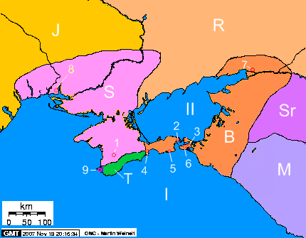 Państwo Scytów na Krymie i jego sąsiedzi, II wiek p.n.e.: I) Morze Czarne II) Morze Azowskie 1) Neapol Scytyjski 2) Pantikapajon 3) Fanagoria 4) Teodozja 5) Kimmerikon 6) Hermonassa 7) Tanais 8) Olbia 9) Chersonez Taurydzki S) Państwo scytyjskie na Krymie B) Królestwo Bosporańskie J) Jazygowie R) Roksolanie Sr) Syrakowie M) Meotowie T) Taurowie