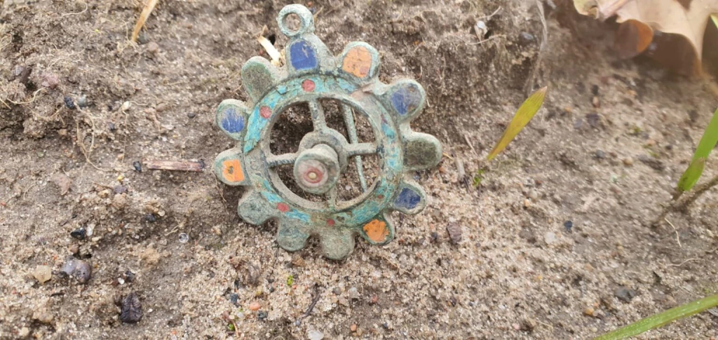 Towarzyszyły mu inne drobiazgi: dodatkowe zapinki, paciorki, pierścionek. Takie zestawy wskazują, że te kolorowe precjoza były własnością dziewczynek z kultury wielbarskiej, związanej z Gotami. Przedmioty tego typu nie były wytwarzane na miejscu. Produkowano je w prowincjach Imperium Rzymskiego, w Galii i Recji, między końcem I a połową II wieku. Pełniły nie tylko funkcję użytkową czy ozdobną. Dla małej właścicielki mogła to być zarówno ulubiona zabawka, jak i amulet mający ją chronić. Fakt, iż taka delikatna rzecz przetrwała wieki i trafiła tak daleko na północ, świadczy o intensywnych kontaktach handlowych.