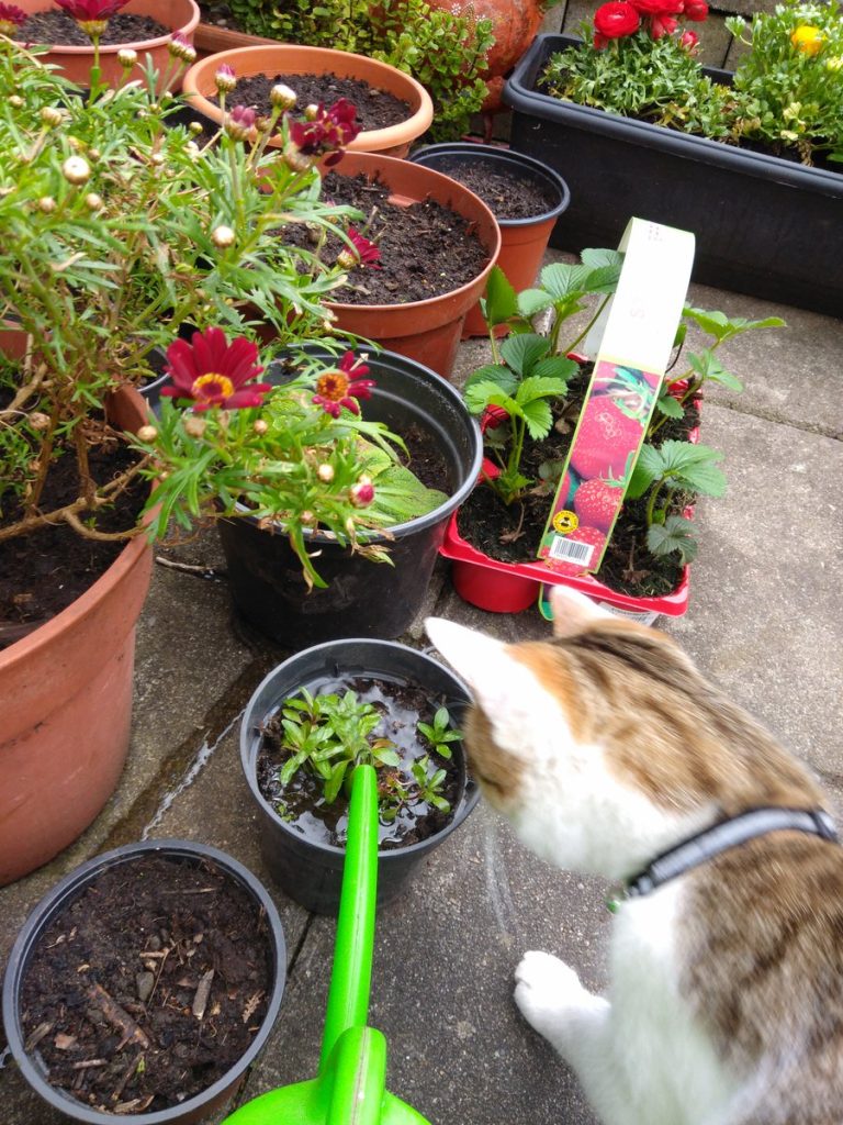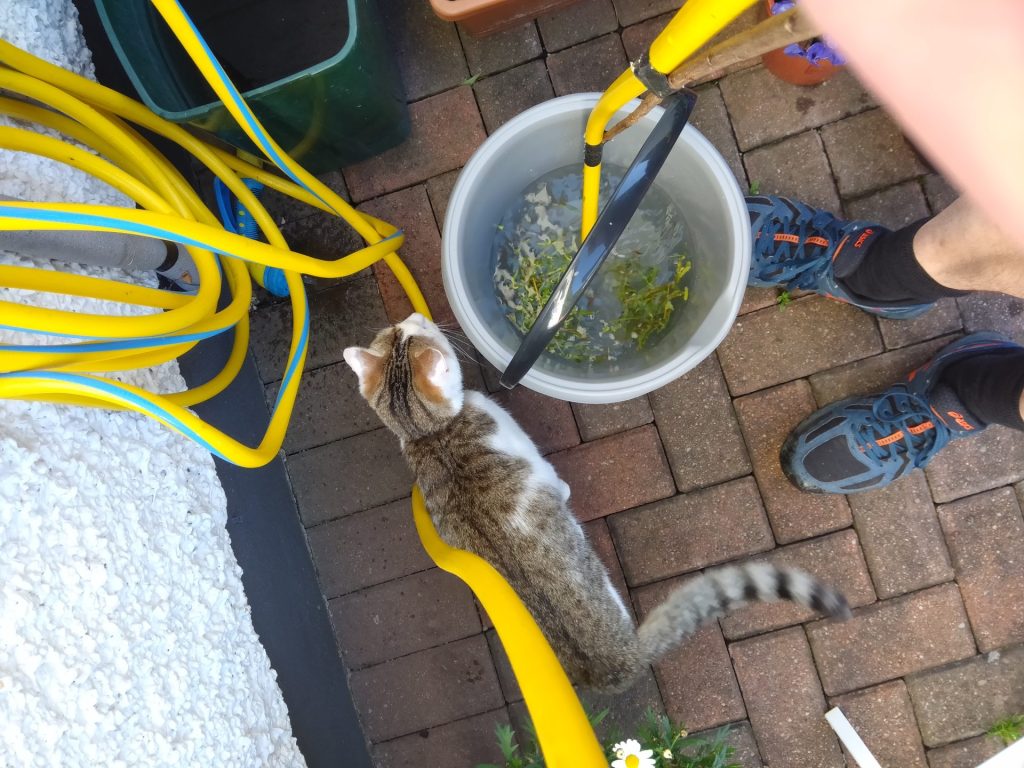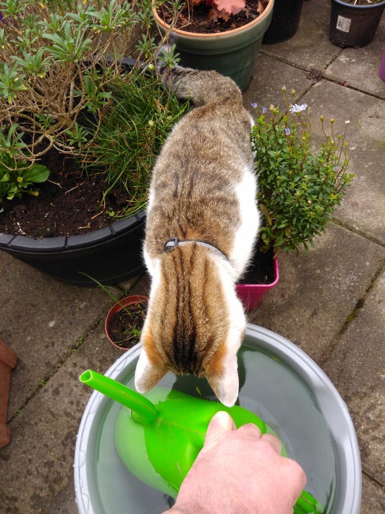 To ja, próbuję podlać moje rośliny wodą z wierzby (oczywiście pod ścisłym nadzorem kota Cricketa)