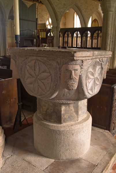 Normańska chrzcielnica z kościoła św. Nonny w Altarnun. Ozdobiona Perunikami, kwiatami Peruna, znanymi również jako znaki gromu… i znaki wodne… i kwiaty życia… Bo to deszcz umożliwia życie??? Skąd wzięły się kamienne chrzcielnice? Może to starożytne kamienne moździerze wypełnione deszczem? O tym związku między chrzcielnicami a moździerzami pisałem w moim poście „Pukające Kamienie”…