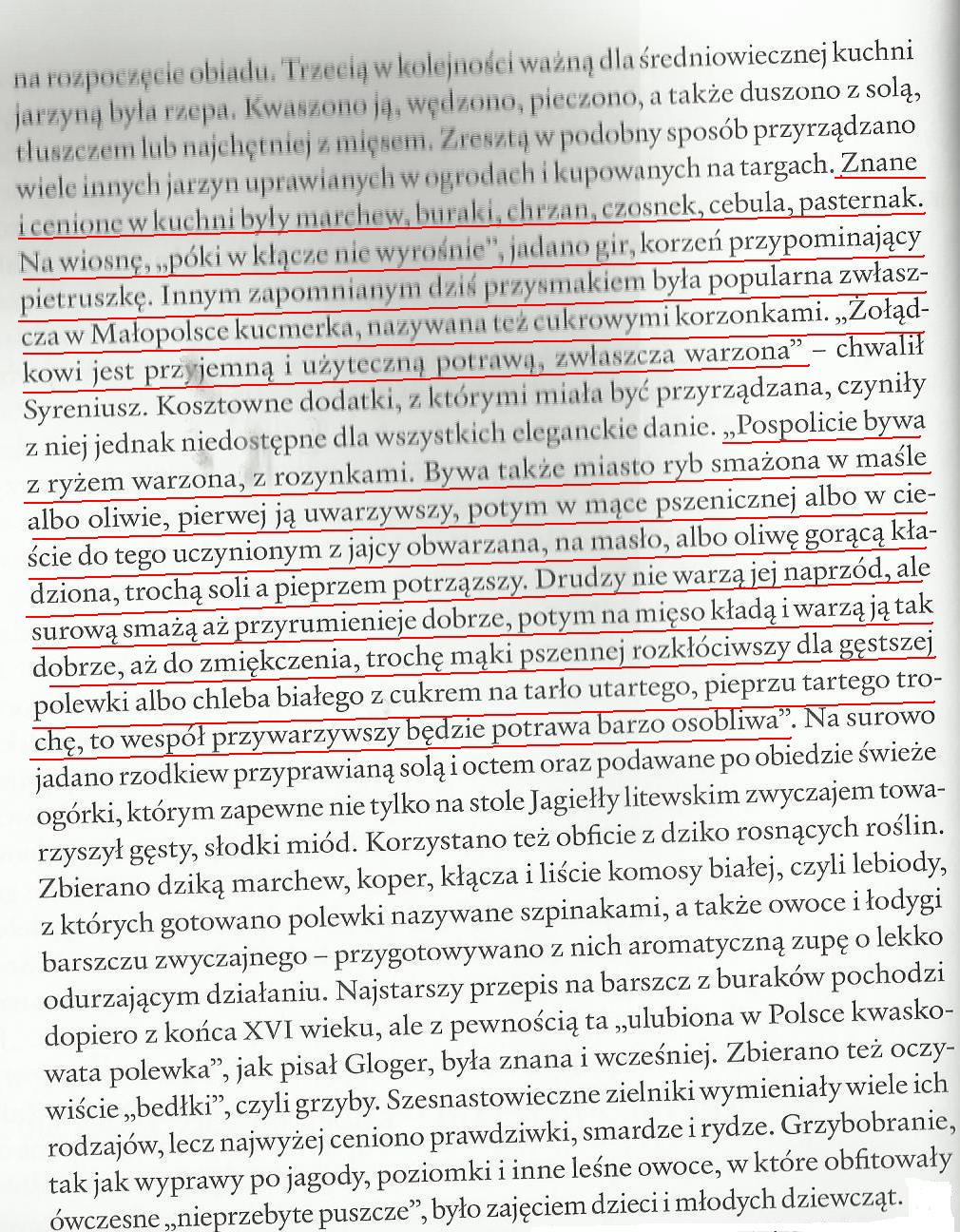 W najstarszej polskiej książce kucharskiej możemy się natknąć na potrawy z topinamburu, pigwy (nie pigwowca, ale właśnie popularnej dawniej pigwy), pasternaku, świerząbka bulwiastego, róży, czy soczewicy. Wśród produktów pochodzenia zwierzęcego natykamy się natomiast na ogromną ilość ryb, raki, żaby, ślimaki, minogi i dzikie ptactwo.