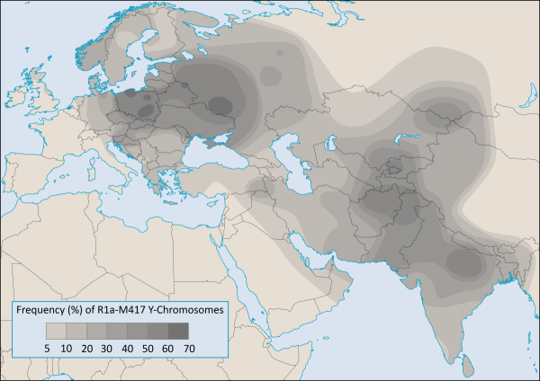 Mapa 1: Występowanie haplogrupy R1a1 (R1a-M417)[14] ; źródło: http://s11.postimg.org/8lih8edcj/1177epk.png